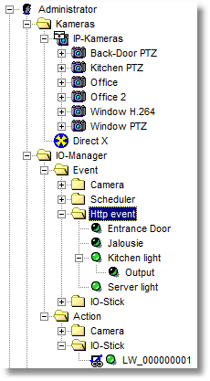 So können Sie bestimmte Funktionen in go1984 "fernsteuern" (zum Beispiel Alarmfunktionen ein-/ausschalten, Kameras aktivieren/deaktivieren etc.) oder verfügbare digitale Ausgänge schalten, die von IP-Kameras, dem logiware Net-IO oder logiware IO-Stick zur Verfügung gestellt werden. Die folgende Grafik verdeutlicht beispielhaft die Verknüpfung, um über das Http event (hier: "Kitchen light") den digitalen Ausgang des logiware IO-Sticks zu schalten: