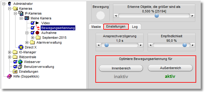 Schon bei der Einbindung Ihrer IP-Kamera haben Sie als Überwachungsumgebung die Option "Innenbereich" bzw."Außenbereich" festgelegt. Sie können diese Voreinstellung überprüfen und falls erforderlich auch ändern.