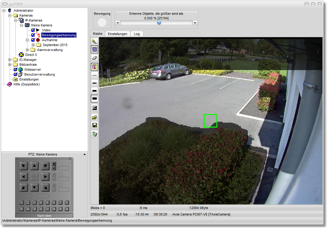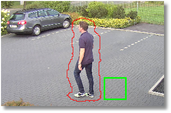 Sobald Sie den korrespondierenden Regler in go1984 bewegen, erscheint im Livebild ein grünes Quadrat, das die Mindestgröße der Objekte widerspiegelt. Stellen Sie die Quadratgröße so ein, dass diese recht deutlich unterhalb der zu erwartenden Objektegröße liegt, damit zuverlässig alle Bewegungen detektiert werden können.