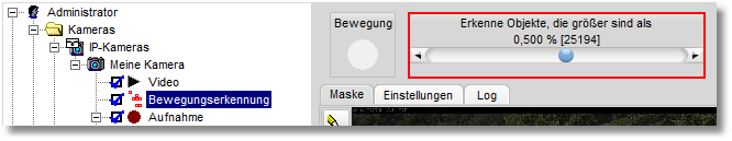 Die Detektion erfolgt anhand der Mindestobjektröße (Standardwert: 0,03 %). Der Wert wird im Verhältnis zum Gesamtbild angezeigt, bspw. muss ein erkanntes Objekt 0,5% der Gesamtfläche einnehmen. Zusätzlich wird ihnen der korrespondierende Absolutwert in Pixeln in eckigen Klammern angezeigt. In unten stehendem Beispiel entsprechen 0,5 % der Gesamtpixel bei einer Auflösung von 2.592 x 1.944 exakt 25.194 Pixeln.