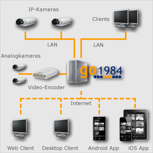 Die Videoüberwachungssoftware verarbeitet dabei neben digitalen Netzwerkkameras (IP Kameras) ebenso analoge Videoquellen über Video-Encoder (auch Videoserver genannt). Unternehmen mit einer bestehenden analogen Videoüberwachung können auf diese Weise den "smarten Umstieg" in die digitale Welt vornehmen und bereits vorhandene Hardware integrieren. Damit leistet go1984 einen wichtigen Beitrag zum Investitionsschutz.