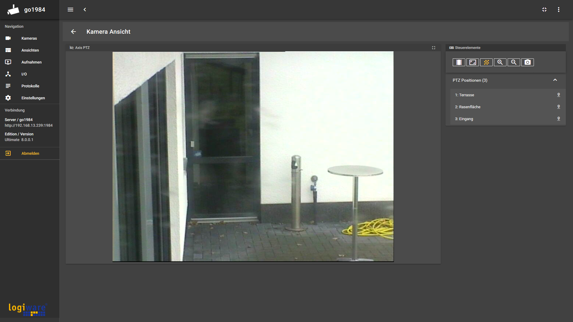 Handelt es sich um eine steuerbare PTZ-Kamera, so können Sie einfach in das Bild klicken, um die Kamera in die entsprechende gewünschte Richtung zu bewegen. Über Strg + Maus-Scrollrad können Sie ggf. den optischen Zoom der Kamera steuern.