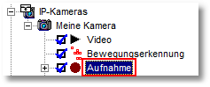 Der digitale Eingang einer IP-Kamera ist mit einer Türklingel verbunden. Es soll immer dann eine Aufzeichnung erfolgen, wenn ein Besucher den Klingelknopf betätigt. Wählen Sie dazu zunächst im go1984-Explorer die gewünschte Kamera aus und selektieren Sie die Option "Aufnahme".