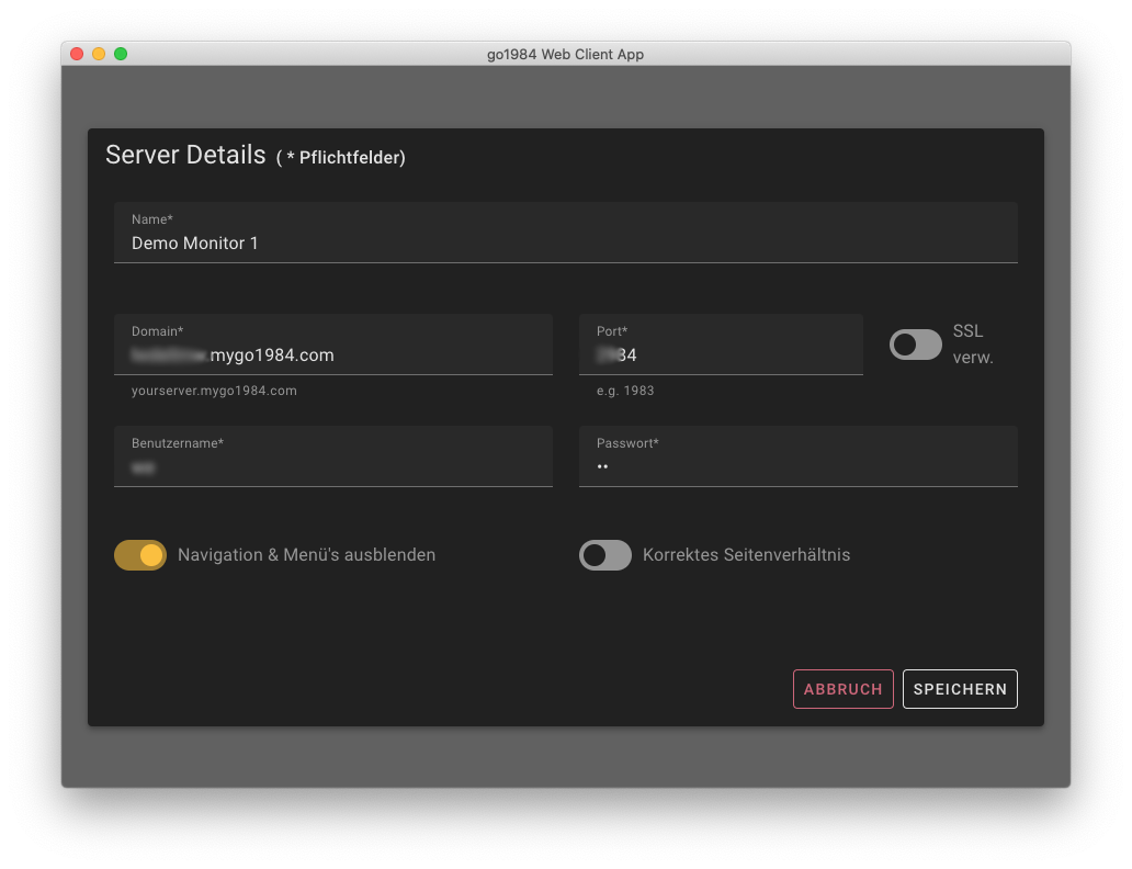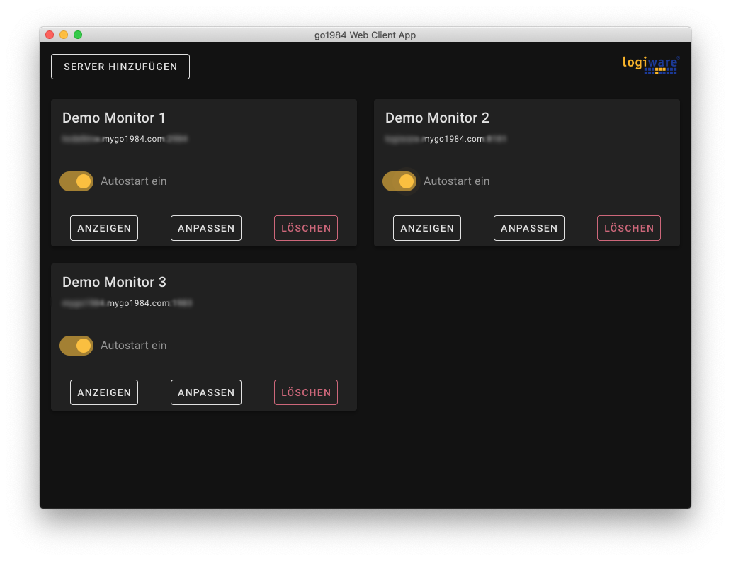 Klicken Sie anschließend auf "speichern", Ihr soeben hinzugefügter Server wird dann im Hauptfenster angezeigt (Demo Monitor 1, wir haben zur Veranschaulichung
