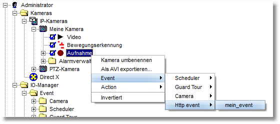 Möchten Sie zukünftig eine go1984 Funktion wie bspw. die Aufnahme einer Kamera über eine der Client-Lösungen "fernsteuern", so verknüpfen Sie das Event im nächsten Schritt per Maus-Rechtsklick mit der gewünschten Funktion: