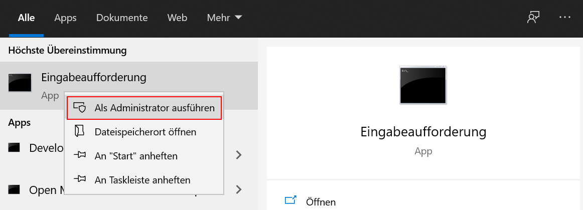 go1984 muss zuvor wie im Kapitel Installation beschrieben installiert werden. Beenden Sie go1984, falls es noch ausgeführt wird. Starten Sie dann die DOS Shell per Maus-Rechtsklick explizit als Administrator.