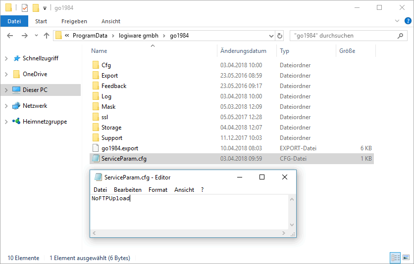 Dazu muss unter C:\ProgramData\logiware gmbh\go1984 eine Datei "ServiceParam.cfg" mit dem Inhalt "NoFTPUpload" angelegt werden. Erstellen Sie dazu eine *.txt Datei, die Sie anschließend entsprechend umbenennen.