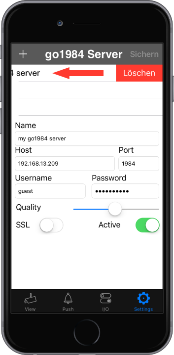 Um einen zuvor definierten go1984 Server wieder zu löschen, "wischen" Sie einfach von rechts nach links über den Servernamen und tippen anschließend auf "Löschen".