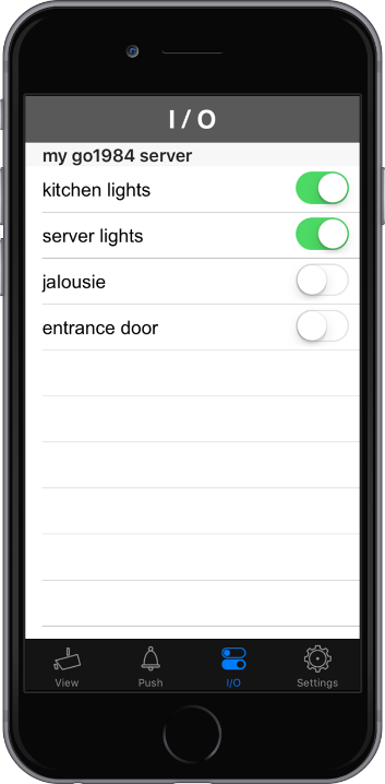 Wurden auf dem hinterlegten go1984 Server "Http events" angelegt, so können Sie diese über den Client schalten. Weitere Informationen zu dem Thema "Http events" finden Sie hier im entsprechenden Kapitel. Tippen Sie zur Anzeige der verfügbaren digitalen Schaltausgänge auf den Punkt "I/O":