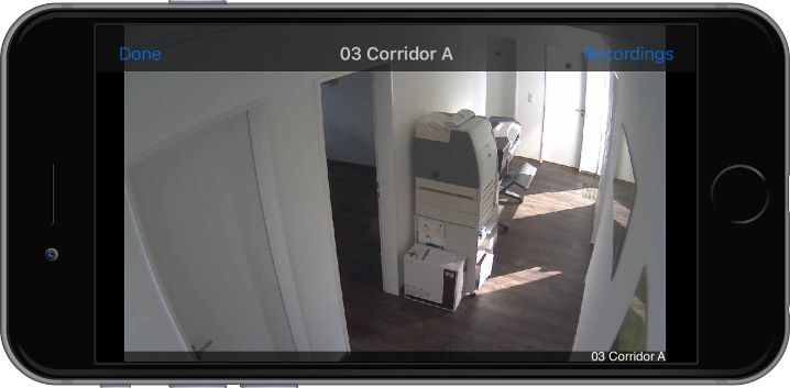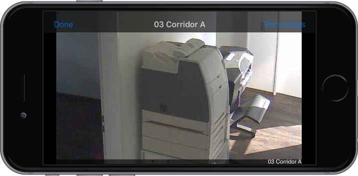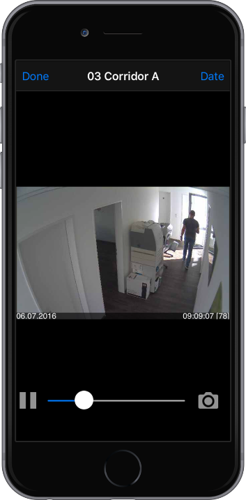 Wählen Sie "Done", um zur Kameraübersicht zurückzukehren. Die Auswahl des Punktes "Recordings" öffnet die Aufnahmenübersicht für die gerade gewählte Kamera. Wiederum können Sie über den Bildschirm "wischen", um in den Aufnahmen zu blättern und zwei Mal auf ein Bild tippen, um die gewünschte Aufnahme wiederzugeben. Während der Wiedergabe steht ebenso die oben beschriebene digitale PTZ-Funktion zur Verfügung. Tippen und schieben Sie die unterhalb der Szene zu sehende Ablaufkontrolle, um schnell an die gewünschte Stelle innerhalb der Aufnahme zu gelangen. Zudem können Sie die Wiedergabe pausieren bzw. fortsetzen und das aktuelle Bild speichern: