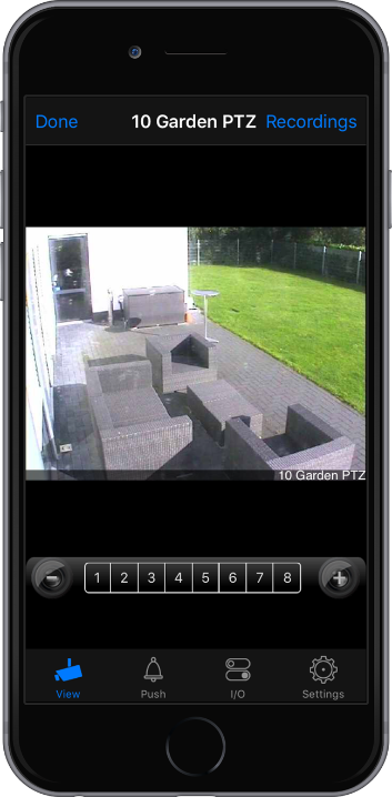 Unterhalb des Bildes finden Sie Bedienfelder für Kameras mit Zoom-Funktionalität ("-" bzw. "+") sowie die Möglichkeit, zuvor in go1984 definierte Positionen anzusteuern ("1" - "8").