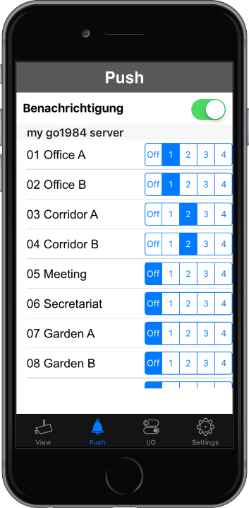 Zudem haben Sie die Möglichkeit, bei erkannter Bewegung eine Meldung via iOS Push zu erhalten. Je Kamera kann dabei die gewünschte Push Bedingung gewählt werden: