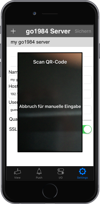 Um einen neuen Server anzulegen, wählen Sie zunächst den Punkt "Settings". Sie haben nun direkt die Möglichkeit, den in go1984 angezeigten QR-Code zu scannen, um auf komfortable Weise alle Verbindungseinstellungen zu hinterlegen.