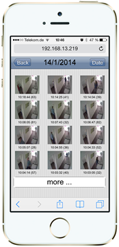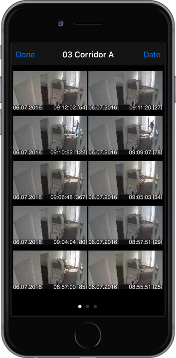 Je Kamera steht Ihnen das gesamte Aufnahmenarchiv zur Verfügung. Sie können dabei ganz einfach in den zur Verfügung stehenden Szenen eines Tages blättern oder einen weiteren Tag auswählen. Damit Sie schnell die relevante Szene finden, wird für jede Aufnahme ein Vorschaubild angezeigt, dessen Auswahl die Wiedergabe der gewünschten Szene startet.