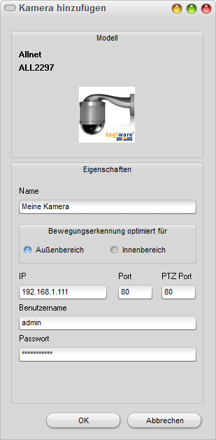 Tragen Sie hier die IP-Adresse oder den Hostnamen der Kamera ein. Sollten Sie der Kamera noch keine IP-Adresse zugewiesen haben, ziehen Sie bitte die Dokumentation des Kameraherstellers zu Rate. |