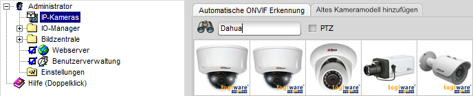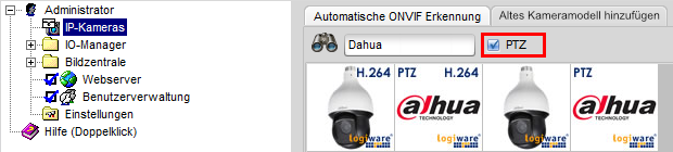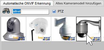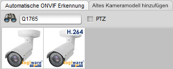 Ebenso kann natürlich eine Ziffernkombination wie "210" oder ein alphanumerischer Filter wie "210a" als Suchbegriff eingegeben werden. Über die Checkbox "PTZ" können Sie die Suche weiter auf bewegliche Kameras (so genannte PTZ-Kameras) eingrenzen. Sollten Sie ihe Kameramodell nicht finden können, versuchen Sie ein anderes Modell des Herstellers oder verwenden Sie die automatische Erkennung über ONVIF.