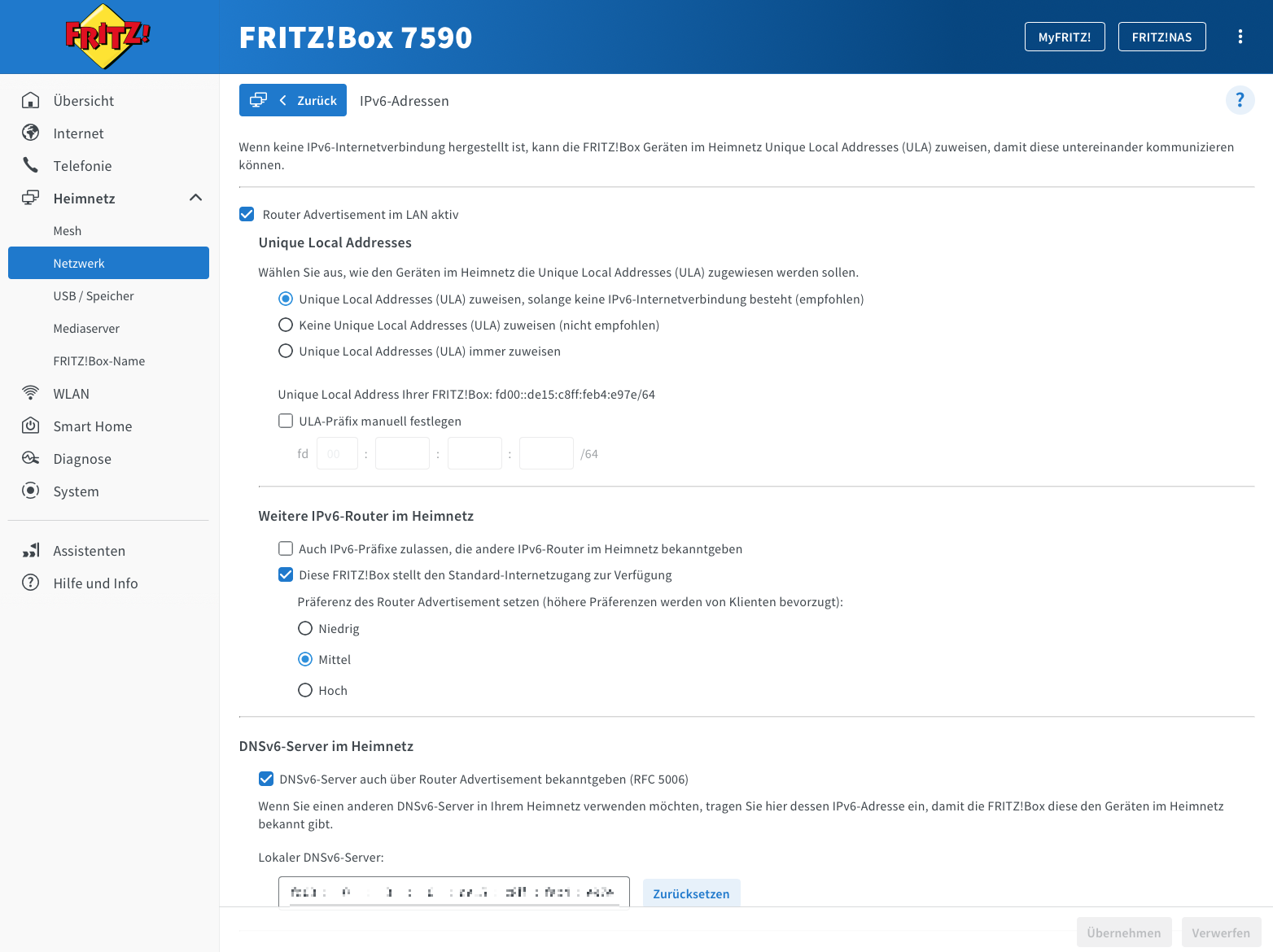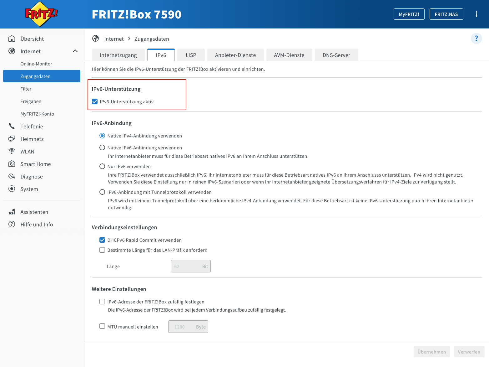 Schauen Sie unter Internet - Zugangsdaten, ob Ihre Fritz!Box bereits für IPv6 konfiguriert ist.