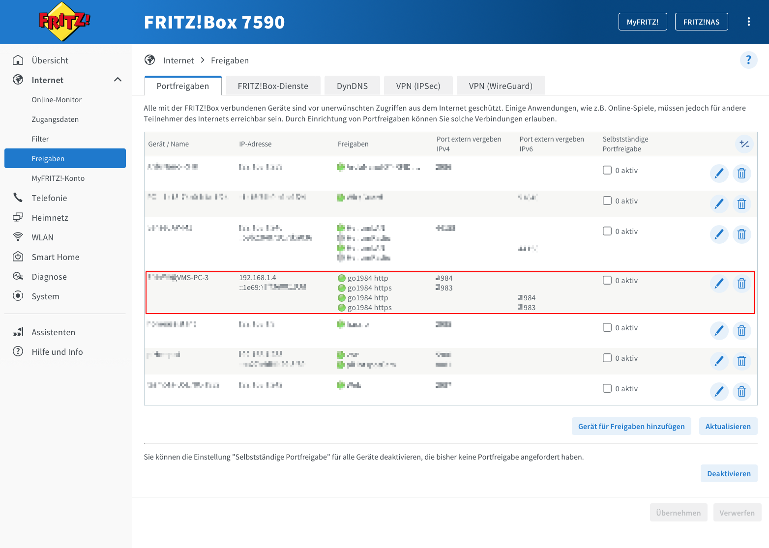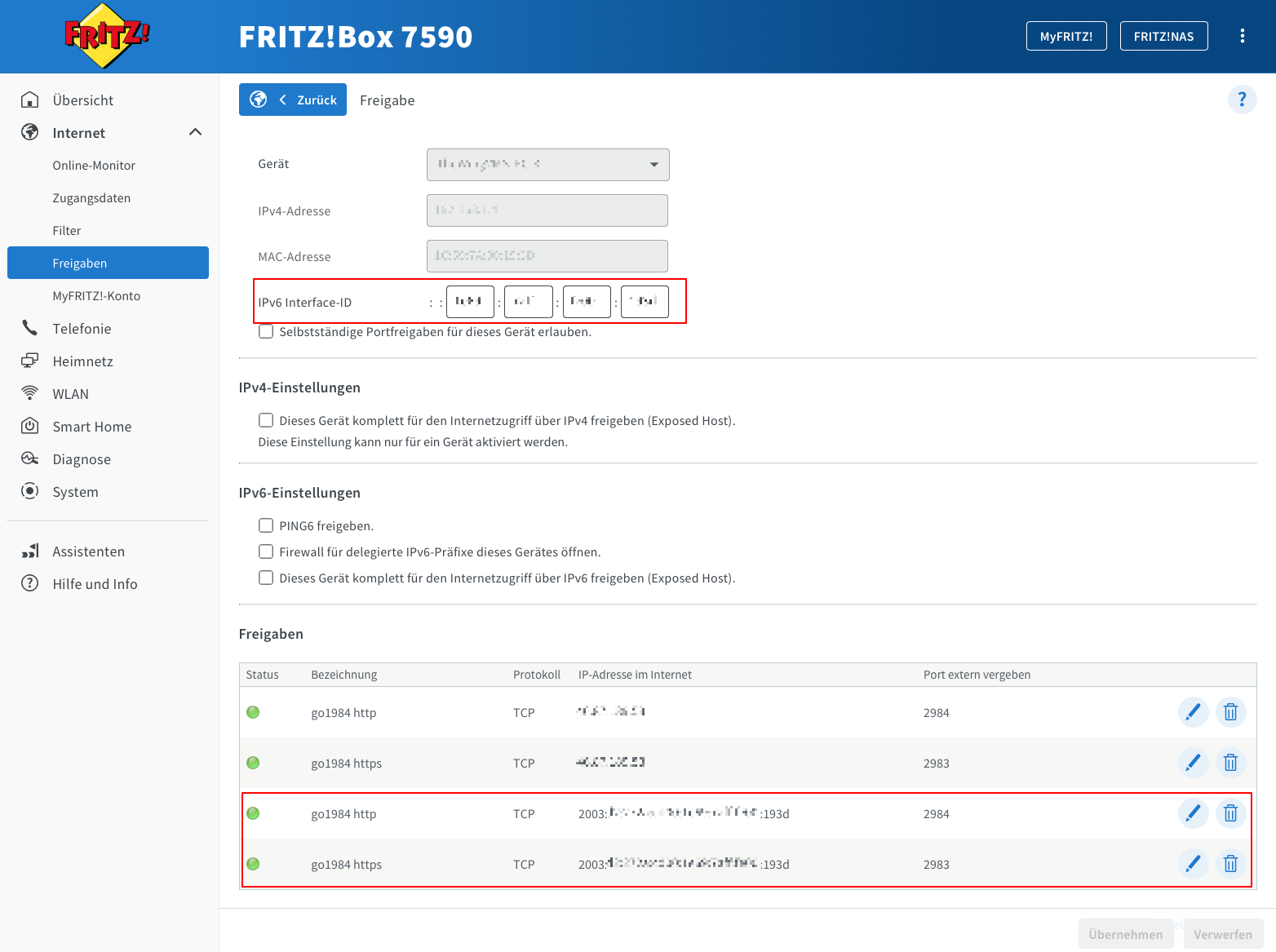 Für den Zugriff über das Internet müssen die vom go1984 Webserver verwendeten Ports (Standard https Port"1983" / http Port"1984") im Router so konfiguriert werden, dass Anfragen über das Internet an den Rechner weitergeleitet werden, der go1984 ausführt.
