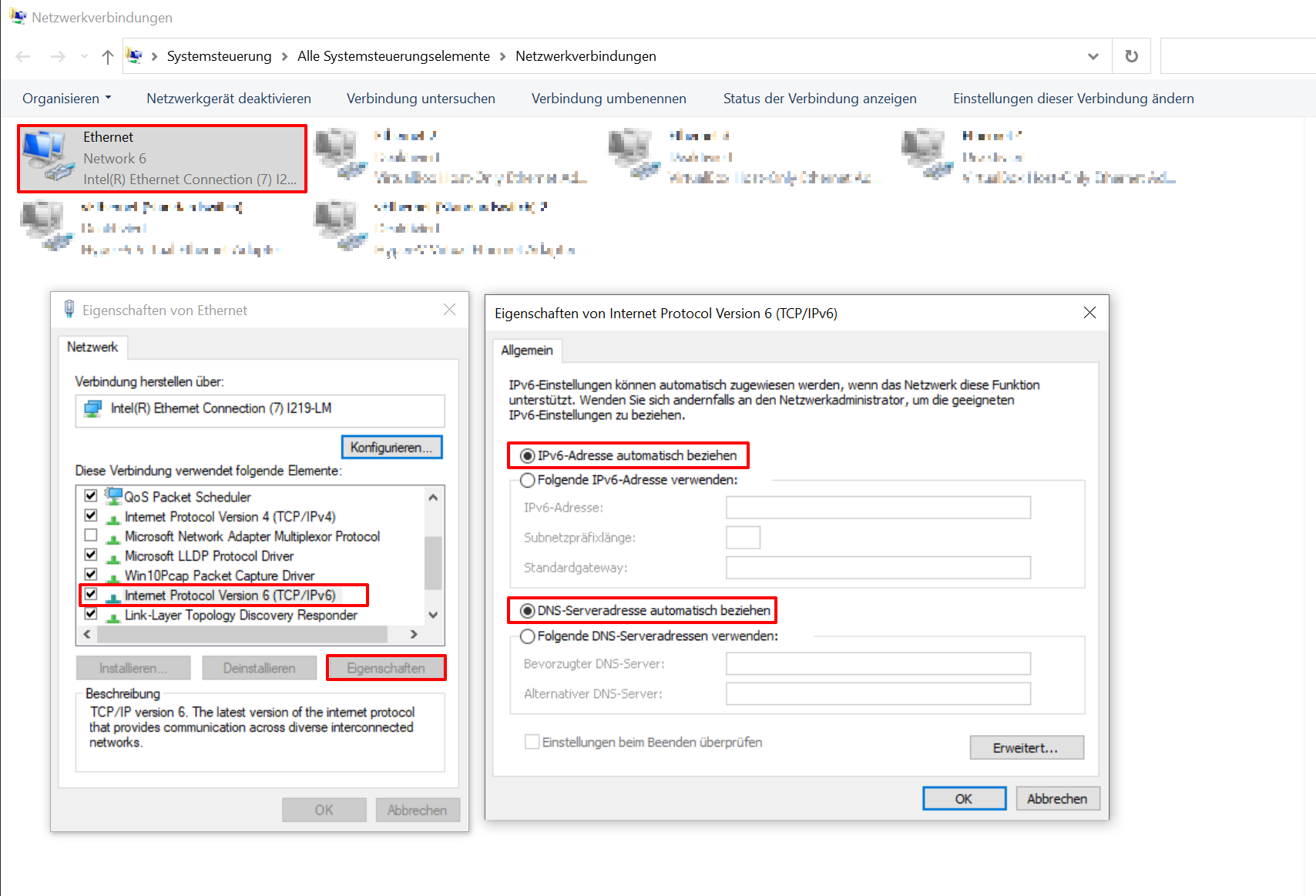 Windows Netzwerk Adapteroptionen: Prüfen Sie, dass IPv6 aktiviert ist und die Standardeinstellungen gesetzt sind.