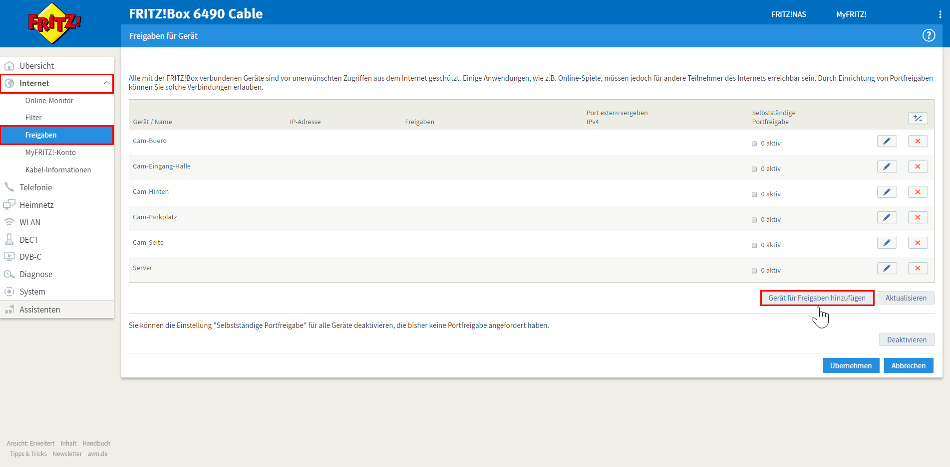 Zunächst wählen Sie unter "Internet" -> "Freigaben" den Schalter "Gerät für Freigabe hinzufügen".