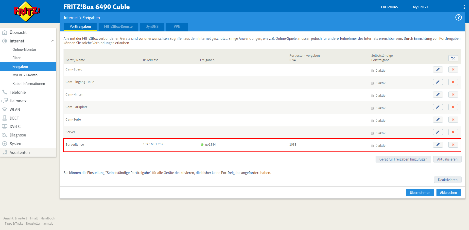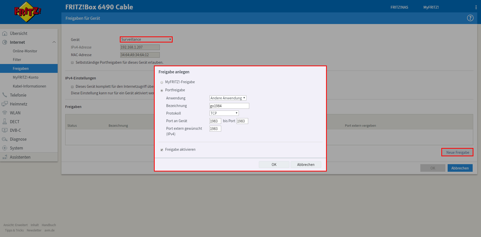 Die neue Freigabe "go1984" auf Port 1983 wird nun korrekt in der Liste der Portfreigaben angezeigt. Der go1984 Webserver ist nun über das Internet erreichbar.