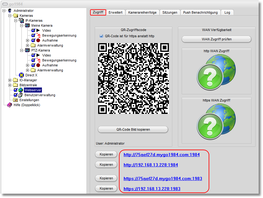 Die URLs für den Zugriff über das Internet und im lokalen Netz werden Ihnen in go1984 angezeigt. Sie können die URLs über den entsprechenden Schalter kopieren oder durch Mausklick direkt testen.