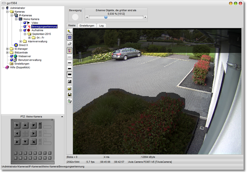 Häufig ist es sinnvoll, bestimmte Bereiche des Kamerabildes von der Bewegungserkennung auszuschließen. Gerade in Außenbereichen minimeren Sie die Anzahl von Fehlalarmen mitunter beträchtlich, wenn nicht relevante Bereiche maskieren. Dazu können Sie eine beliebige Maske über das Bild zeichnen. Es stehen Ihnen hierzu diverse Hilfsmittel zur Verfügung. Zur Kontrolle wird die Maske transparent auf dem Bild angezeigt. Eingegraute Bereiche bleiben in der Folge unberücksichtigt.