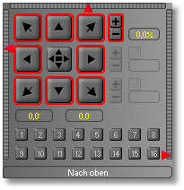 Klicken Sie auf die Taste im Zentrum und halten Sie die Maustaste gedrückt. Bewegen Sie nun die das Mauskreuz innerhalb des PTZ-Feldes, um die Kamera an die gewünschte Position zu bewegen und so komfortabel gleichzeitig die Schwenk- und Neigefunktion zu bedienen: