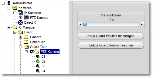 Legen Sie in dem "IO-Manager" unter "Event"->"Guard Tour" zunächst eine neue Guard Tour mit der gewünschten Anzahl an Positionen an, die Sie im weiteren Verlauf mit den Kamera Preset-Positionen verknüpfen möchten. Über den sichtbaren Schieberegler können Sie eine allgemeine Verweildauer pro Position in Sekunden festlegen: