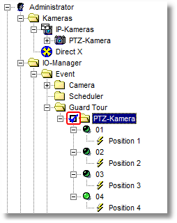 Für PTZ-Kameras mit Preset-Unterstützung seitens go1984 können Guard-Touren angelegt werden, die es erlauben, definierte Kamerapositionen mit einstellbarer Verweildauer automatisch anfahren zu lassen.