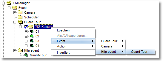 Ebenso können Sie per Maus-Rechtsklick bspw. einen Zeitplaner oder ein zuvor erstelltes HTTP event auf das Optionsfeld verknüpfen, um die Guard-Tour nur zu definierten Zeiten zu starten bzw. über eine der Client-Lösungen aktivierbar zu machen: