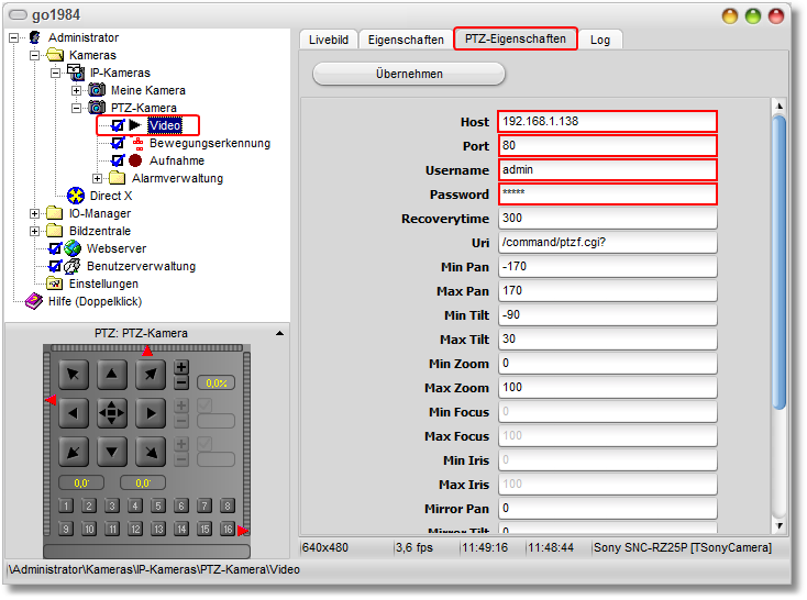 Sollte das Livebild der Kamera erscheinen, jedoch keine PTZ-Steuerung möglich sein, überprüfen Sie bitte die Einstellungen für "Host", "Port", "Username" und "Password" unter Video -> PTZ-Eigenschaften auf Richtigkeit.
