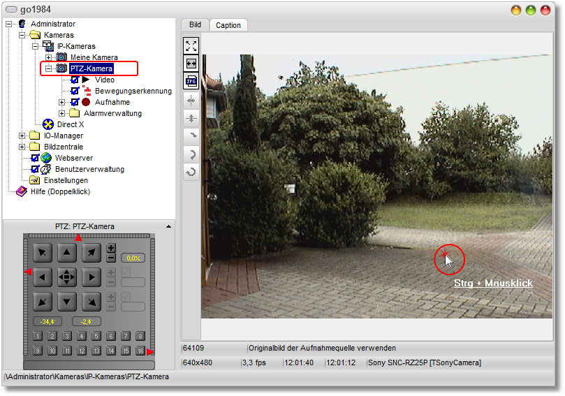 Ist das Livebild zu sehen und der Kameraname fokussiert, kann die Kamera auch über die Strg-Taste und Mausklick innerhalb des Livebildes gesteuert werden.