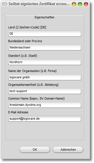 Geben Sie nach Klick des Schalters "Zertifikatsanfrage generieren..." die erforderlichen Daten wie folgt ein:
