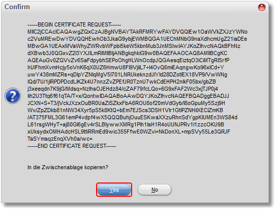 Bestätigen Sie Ihre Angaben mit "OK". go1984 generiert die Zertifikatsanfrage, die Sie direkt in die Zwischenablage kopieren können, um das SSL-Zertifikat bei der Zertifizierungsstelle Ihrer Wahl anzufordern.