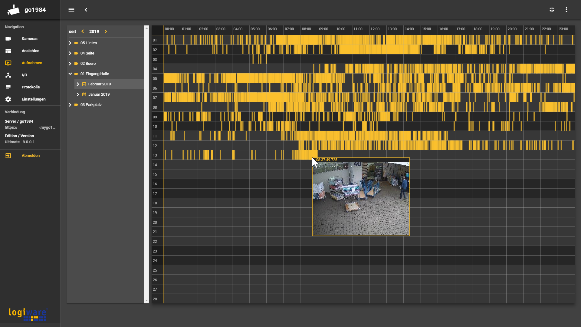 In der Monatsübersicht werden Aufnahmen mit entsprechenden Markierungen dargestellt. Einfaches Herüberfahren mit der Maus zeigt eine Vorschau der Szenendatei an.